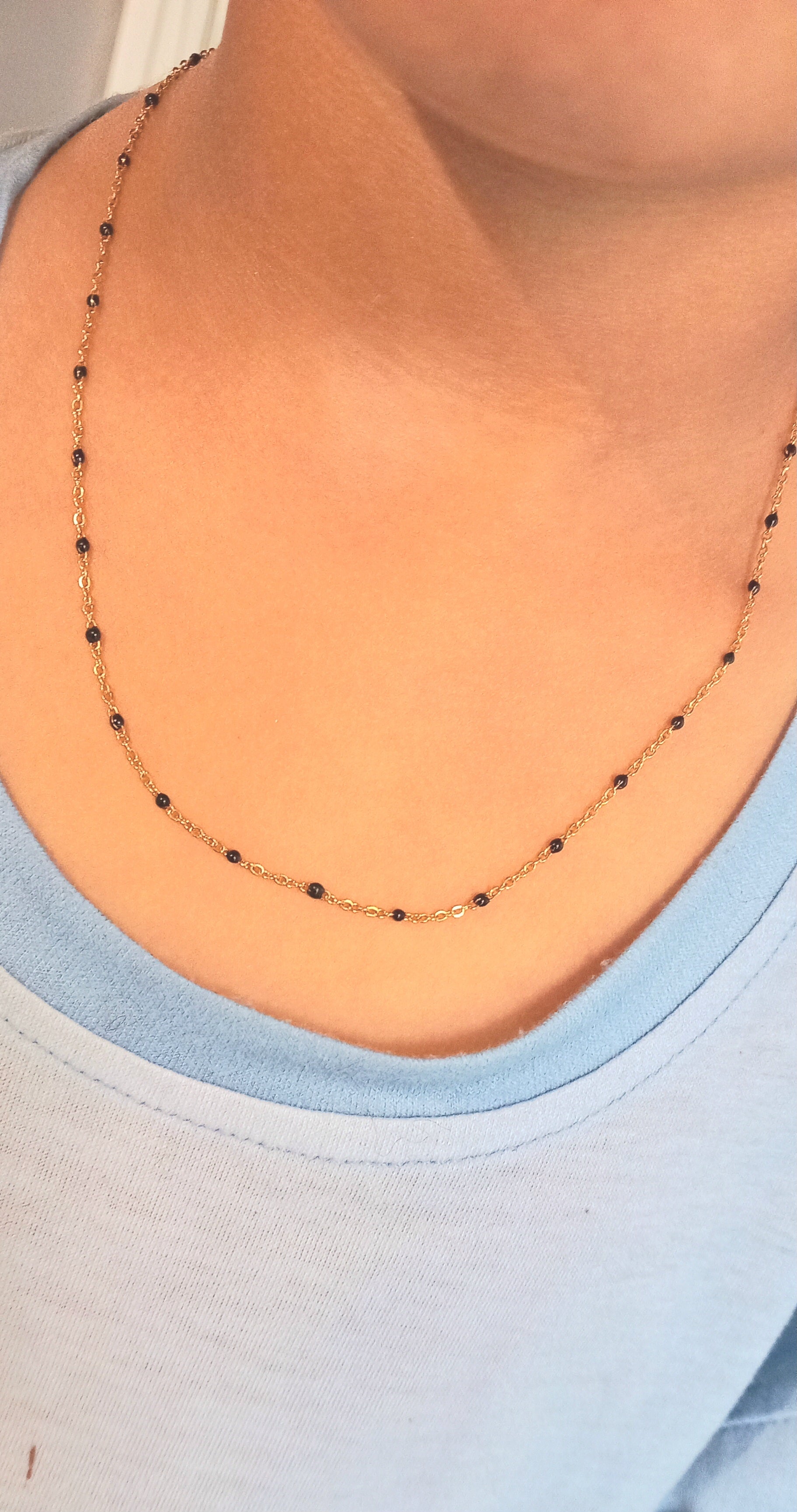 Profitez de la perfection minimaliste et épurée du Collier "Elisa", conçu pour s'adapter à toutes les occasions. Fabriqué à partir d'acier inoxydable doux et facile à porter, ce collier mesure 40 cm de long et offre un très bel équilibre entre le noir et l'or pour un résultat mémorable et intemporel.